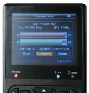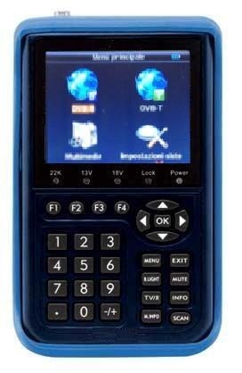 MISURATORE PROFESSIONALE DI SEGNALI DIGITALI TERRESTRI E SATELLITARI CON SCRLa foto è indicativa la custodia potrà essere di vari colori blu Lafayette o verde Stark Teleco in base alla disponibilità in fase di ordine Questo strumento è in grado di demodulare segnali satellitari DVB-S e DVB-T per il digitale terrestre. Strumento indispensabile per gli installatori di antenne e parabole. Interamente controllato da microprocessore, lo strumento risulta affidabile in qualsiasi condizione operativa. All'accensione, sullo schermo verranno visualizzate le immagine del canale sintonizzato con la relativa intensità del segnale. Tramite il menu interno sarà possibile impostare diversi parametri in base alle preferenze dell'utilizzatore. Semplice e preciso con visualizzazione dell'intensità del segnale in dBm. Sul display vengono visualizzati anche i parametri relativi all'azimuth ed elevazione per il corretto puntamento dell'antenna, CBER/VBER, qualità del segnale, intensità del segnale sia per il DVB-T che DVB-S, nello stesso menu inoltre possono essere visualizzati cinque canali, funzione molto utile per una regolazione ottimale del sistema di antenna. Nel modo DVB-S possono essere rilevati segnali molto deboli, supportando alimentazioni di antenna in 5V/15V/24V con autoprotezione contro il corto circuito. Lo strumento include gli ingressi AV IN e AV OUT per la telecamera, monitor etc. Per l'alimentazione e la ricarica della batteria interna utilizzare l'apposito adattatore AC/DC fornito in dotazione con tensione di uscita a 12V DC 1,5A. La batteria interna dello strumento è del tipo al Litio a 8,4V 3000mAH, la quale può esser ricaricata in circa 6 ore garantendo una autonomia operativa di circa 5 ore (in base al carico esterno richiesto dall'antenna). Lo strumento viene fornito con una custodia blu in PVC
