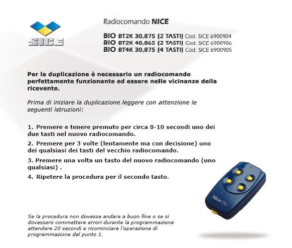 RADIOCOMANDO NICE BIO BT2K 30.875 2 TASTI
