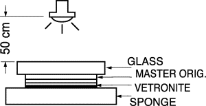 1) Sovrapporre l' originale sulla vetronite, come raffigurato nel disegno, quindi esporre alla luce di una lampada. Attenzione, il tempo di esposizione varia notevolmente secondo il tipo di lampada utilizzata. Per esempio le lampade di tipo U.V. hanno bisogno di un tempo di esposizione di circa 2-3 minuti, le alogene da 800 W di circa 3 minuti.