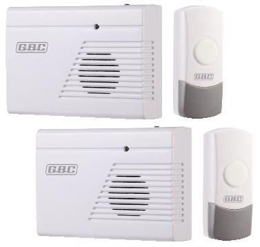 Kit di campanelli senza fili composto da due unità trasmittenti con grado di protezione IP44 e da due riceventi, il tutto alimentato a batterie.