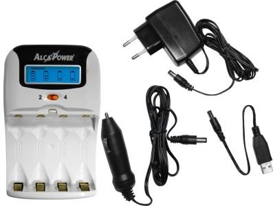 Caricabatteria Rapido per la ricarica di 2 o 4 batterie Ni-MH, formato AA e AAA. Il caricabatteria è dotato di display LCD indicante il Livello di carica delle batterie. Un adattatore da rete fissa, il cavo accendisigari e il cavo per l'alimentazione da porta USB