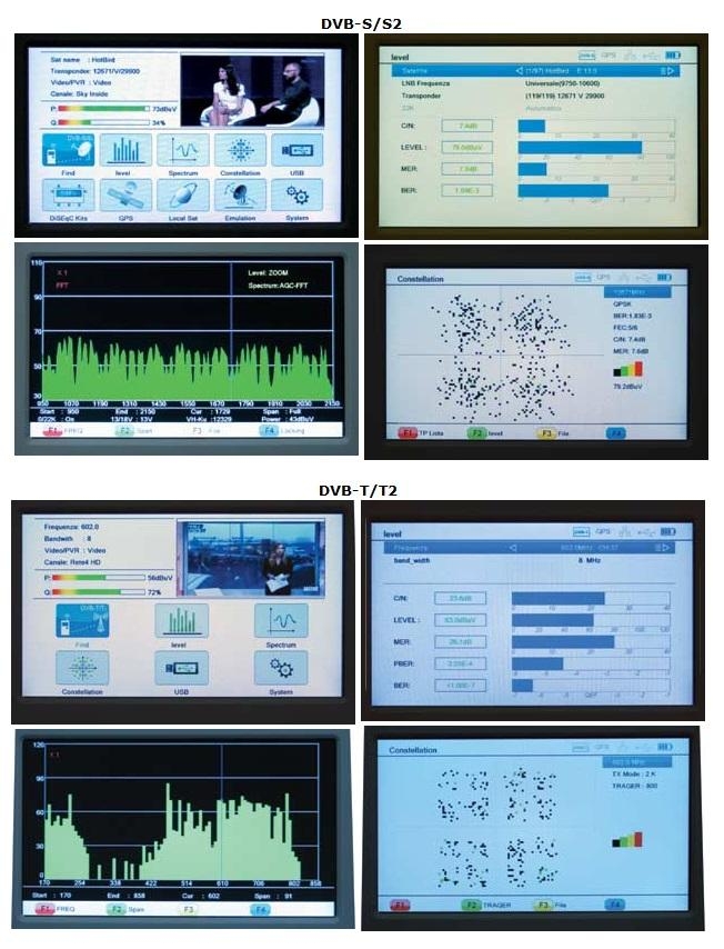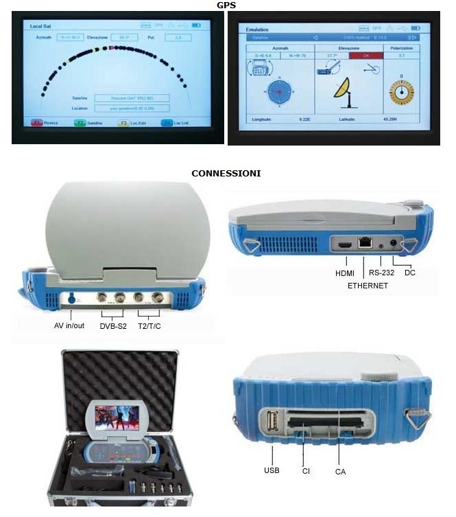 Misurazione DVS-S2 /DVT-T2 / DVB-C Funzione SCR (Satellite Channel Router) Supporta Interfaccia seriale asincrona Allegato A/B/C supportato da DVB-C Spettro multi-analis e real-time Grafico delle costellazioni GPS/LCN BERN, S/N, MER, POWER, Misurazione FEC Auto search, Ricerca manuale Nome satellite e grado di rilevazione automatico Auto DiSEqC1.0 / DiSEqC1.1 / DiSEqC1.2 / USUAL MDU e Unicable Visualizzazione satelliti locali automatica H.264 HDTV Uscita AV-OUT per display esterni Entrata AV-IN per camera e funzione STB Aggiornamenti di sistema tramite porta Ethernet /USB / RS232 Lista dei satelitti modificabile via PC Backup dati Conax / CA inclusi Supporta 13V/18V/22K Calcola l’angolo di puntamento della parabola Multi lingua OSD: Italiano, Inglese, Tedesco, Francese, Spagnolo ect Lista satelliti locali e globali Ricevitore GPS incorporato Display da 7” TFT alta risoluzione Led indicatori aggancio segnale audio / video