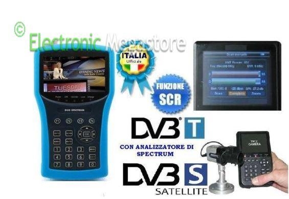Misuratore di segnali satellitari DVB-S e DVB-T con SCR e analizzatore di spettro. Semplice da installare e consente un'identificazione rapida ed accurata del segnale per un più preciso allineamento della antenna satellitare.