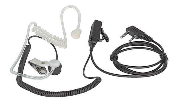 Microfono-auricolare esterno con clip di fissaggio, tasto PTT e cavo spiralato antistrappo. Auricolare trasparente per uso sicurezza e bodyguard. Connettore tipo K.